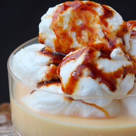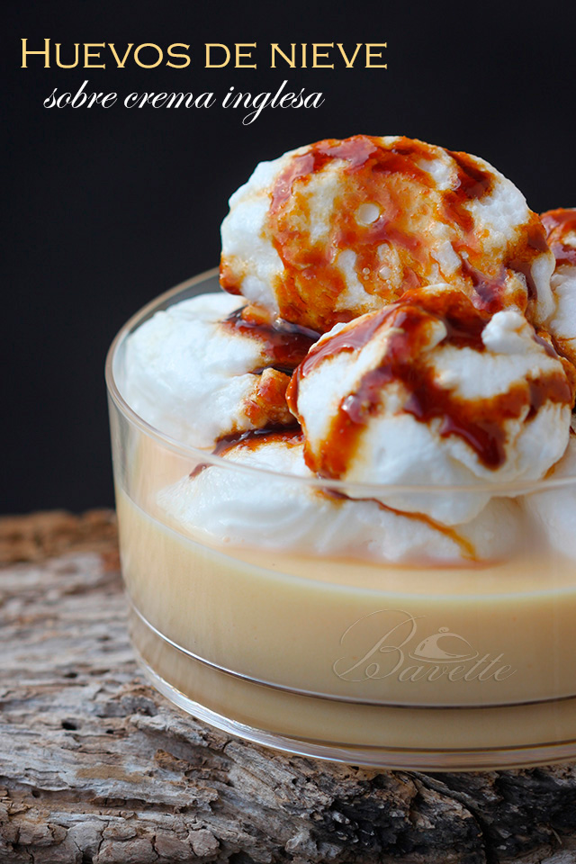 Cuando la crema ingles esté bien fria, montamos las copas con la crema y colocamos las claras cocidas sobre la crema, añadimos por encima el caramelo caliente .