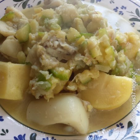 Se corta la sepia en trozos, se pela la patata y se trocea, ponemos una olla con aceite y sofreímos la cebolla en trozos pequeños y la sofreímos, cuando esta transparente ponemos la sepia y la doramos, una vez dorada le ponemos un chorrito de vino blanco dejamos que hierva un poco y ponemos el resto de ingredientes, cubrimos de agua y dejamos cocer hasta que las patatas estén cocidas, probamos de sazón corregimos y listo.