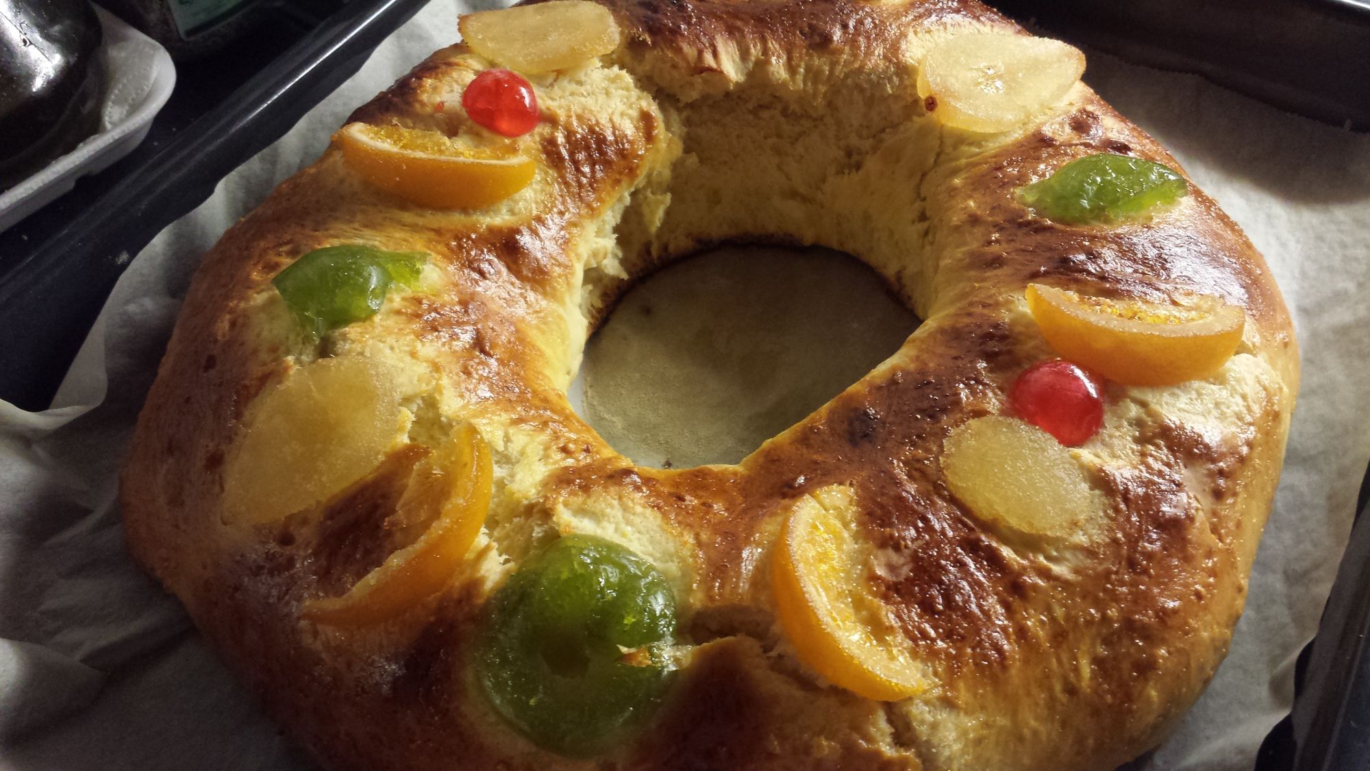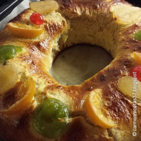 La ponemos encima de la mesa enharinada y la vamos amasando hasta que no se pegue a los dedos, le damos forma de rosca, se puede dividir la masa en dos y hacer dos roscones.