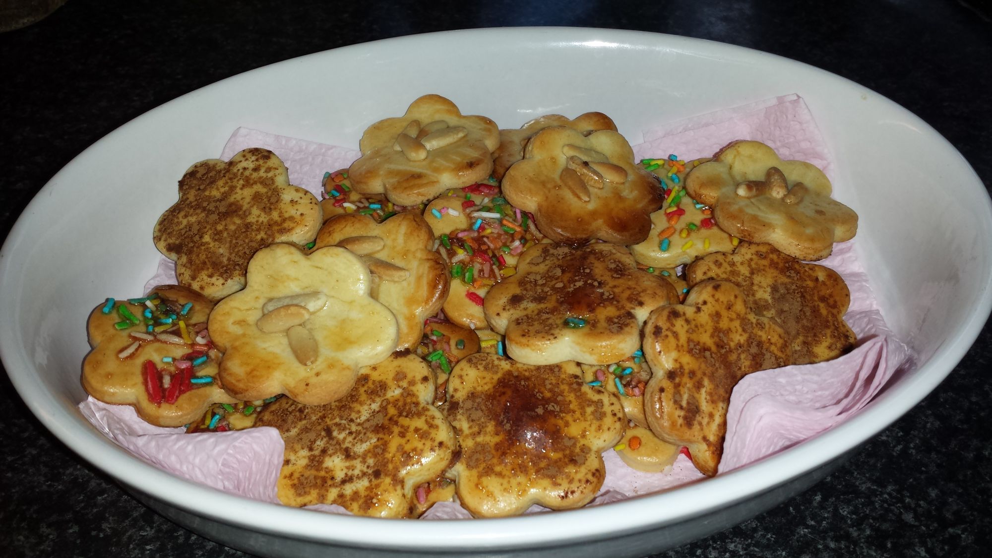 Las ponemos sobre la bandeja del horno que tendremos cubierta con papel de hornear y las pintamos con huevo batido, les ponemos los piñones, la canela y los fideos de colores.