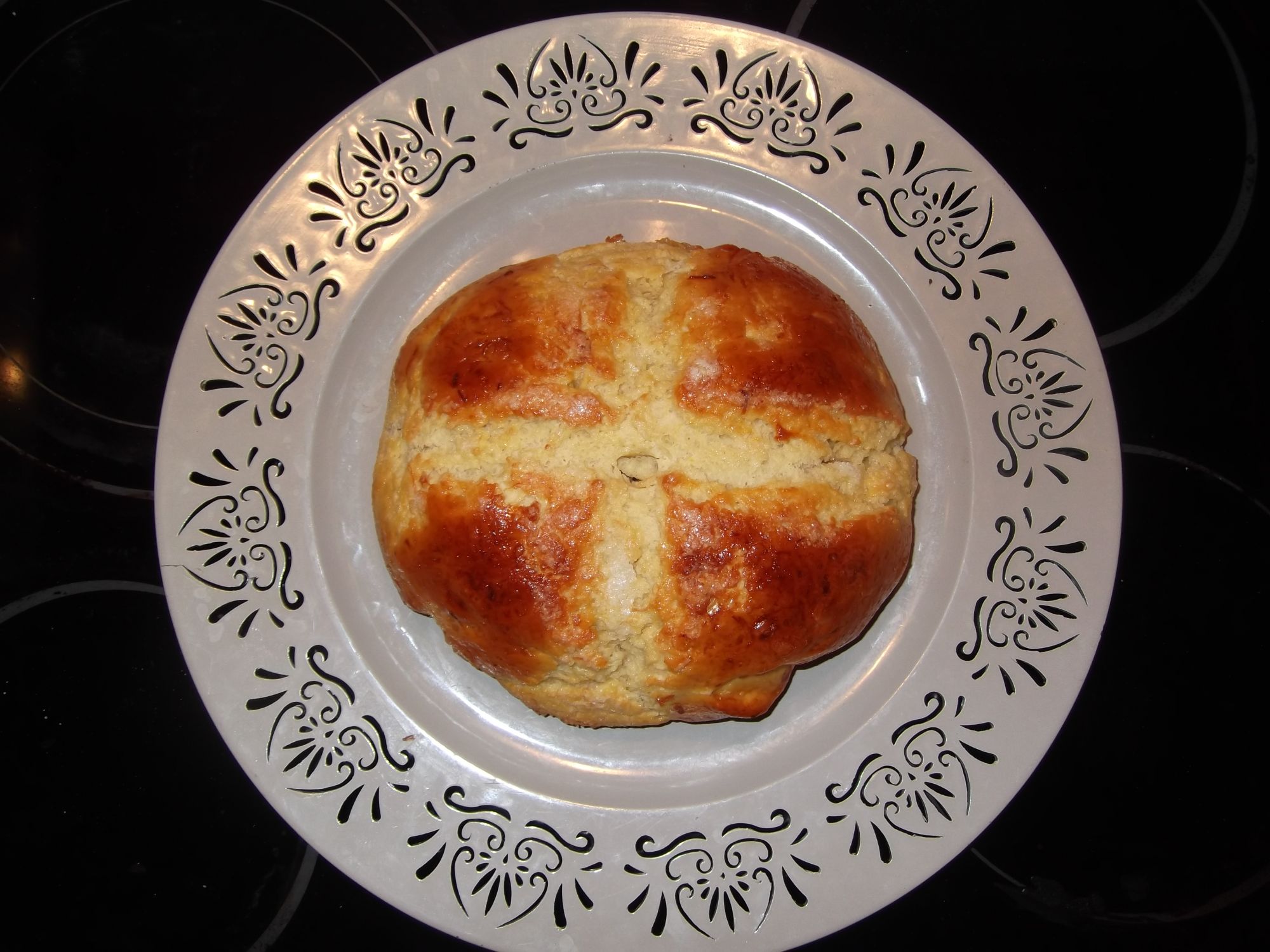 Pasado este tiempo, precalentamos el horno a 180° con temperatura arriba y abajo. Con un cuchillo formamos una cruz, batimos el huevo que nos quedaba y pincelamos el bollo. Con los 40 gramos de azúcar que nos había sobrado, echamos unas gotas de agua removemos y espolvoreamos el panquemado.