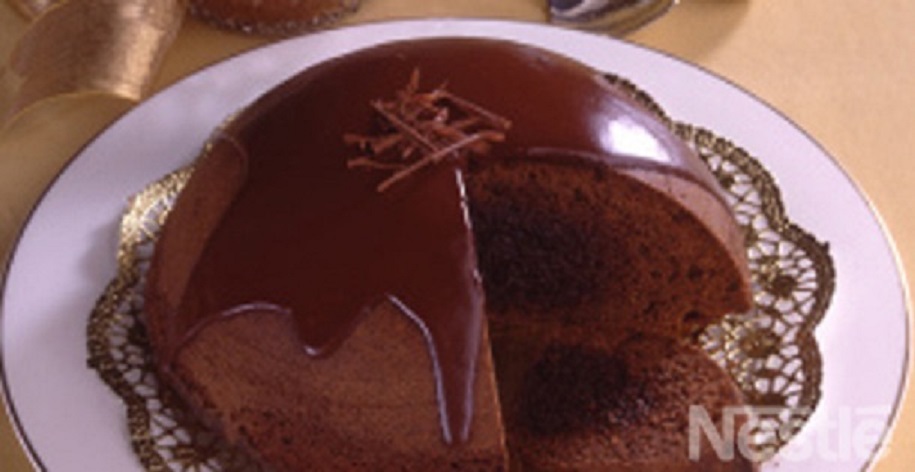 Verter la salsa de chocolate por encima del bizcocho y dejar solidificar ligeramente. Acompañarlo con algo de fruta.