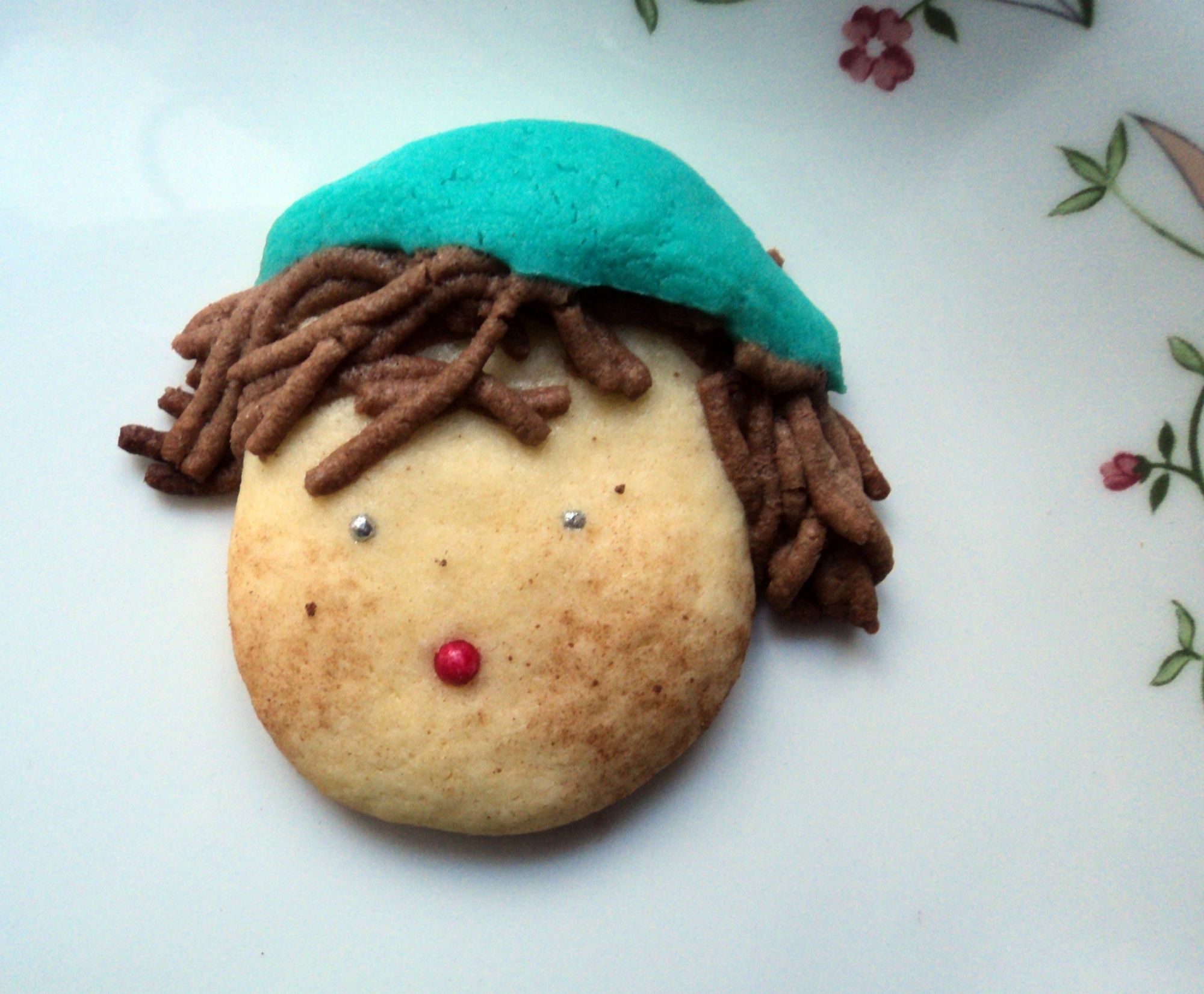 Con la masa azul, estiramos con el mismo grosor de la cara y con un corta pastas cuadrado más pequeño que el redondo hacemos cuadrados que dividimos haciendo dos triángulos que serán el gorro.
