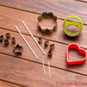 Ahora llega el mejor momento, el de dar forma a las galletas y dejar volar tu imaginación :-) Necesitarás microcortadores como los de la foto, cortadores en forma de flor, corazón etc ,palitos cilíndricos o pajitas y palillos de madera.