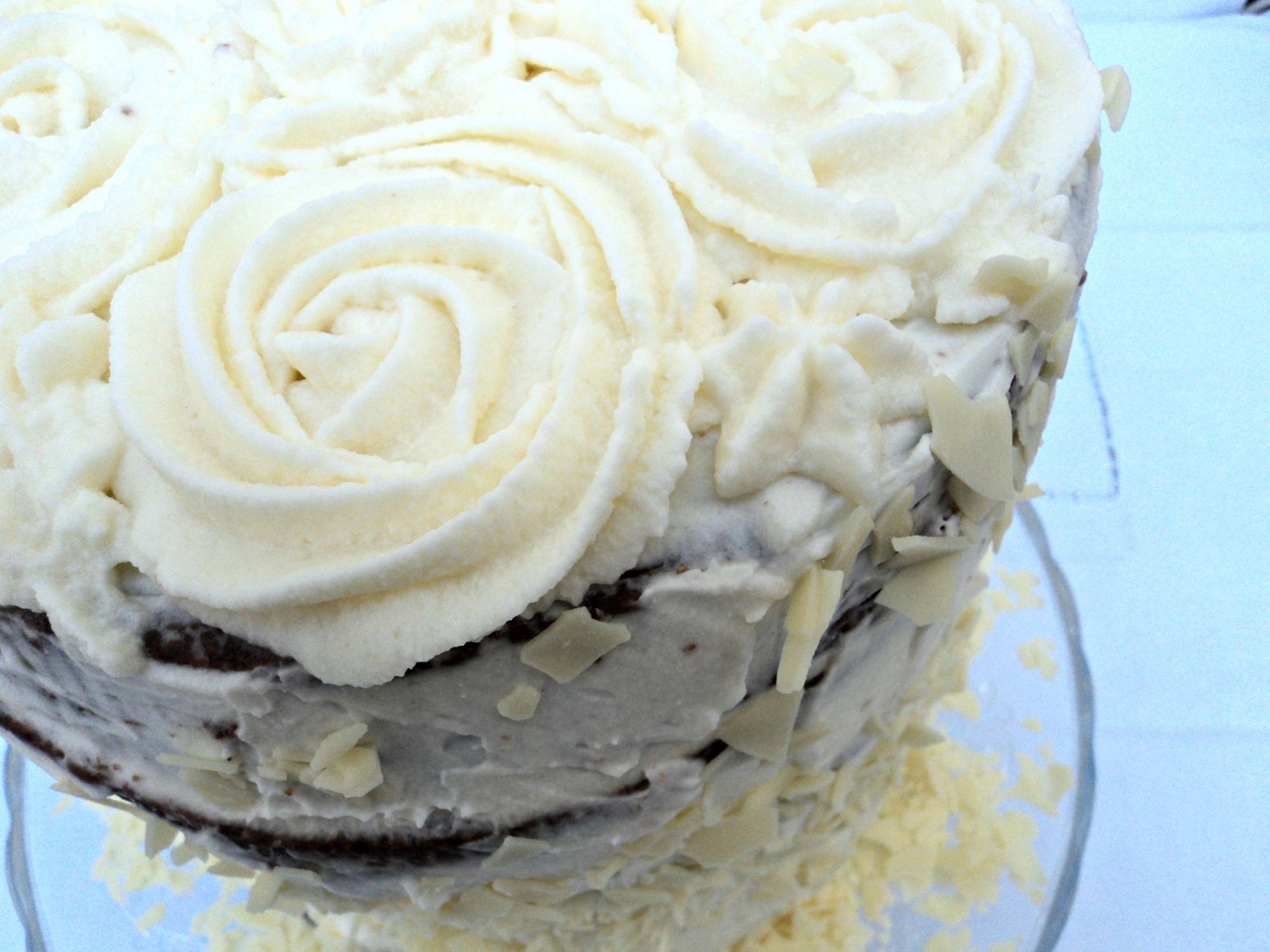 - Decoramos cubriendo con la crema de mascarpone, en la parte de arriba haciendo flores y en los laterales con escamas de chocolate blanco.