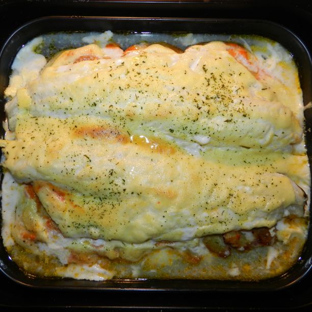 Sobre la base anterior se colocan los lomos de bacalao y la mayonesa.