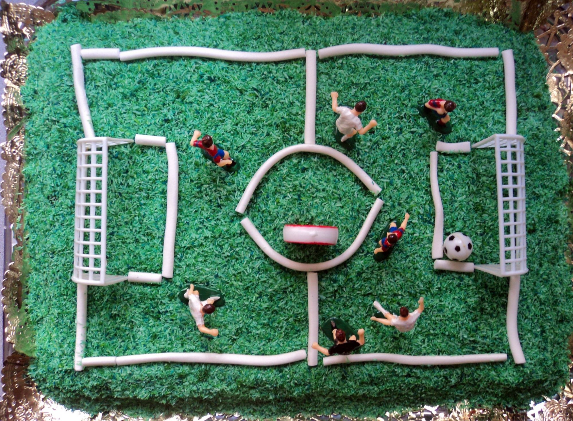 Cuando la cobertura esté seca decoramos poniendo el coco por arriba a modo de césped, las gominolas las abrimos sacando la tira blanca de nata y con ellas vamos dibujando las líneas del campo.