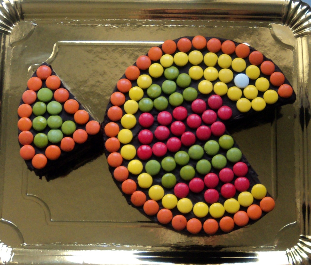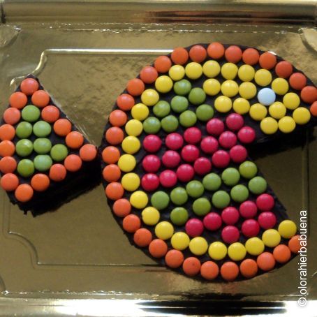 - Untamos toda la superficie del pez con crema de chocolate, una capa fina y decoramos con los lacasitos.