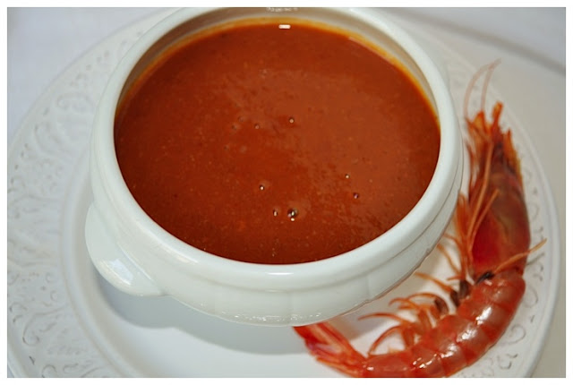 En primer lugar, peláis las gambas y reserváis las cabezas. Con las cáscaras de las gambas, la espina y la cabeza de la merluza hacéis un caldito de pescado, poniendo 3/4 de litro de agua y lo dejáis cocer durante 1/2 hora. Lo coláis y reserváis.