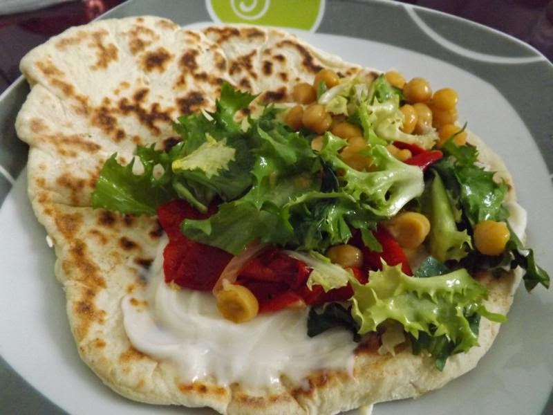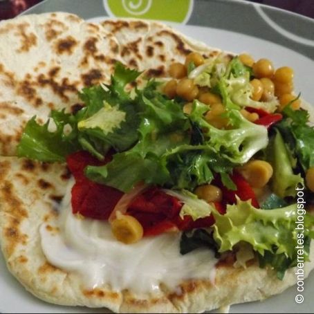 - -"Pan de pita" a la plancha (lo pongo entre comillas porque realmente no es auténtico pan de pita, es un plan que se hace a la plancha en un instante y que tiene resultados espectaculares). Para unos 6 panes: