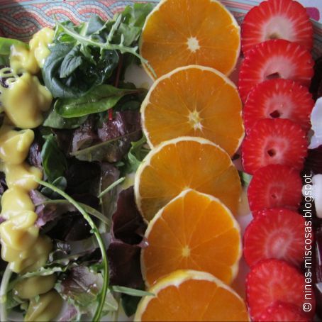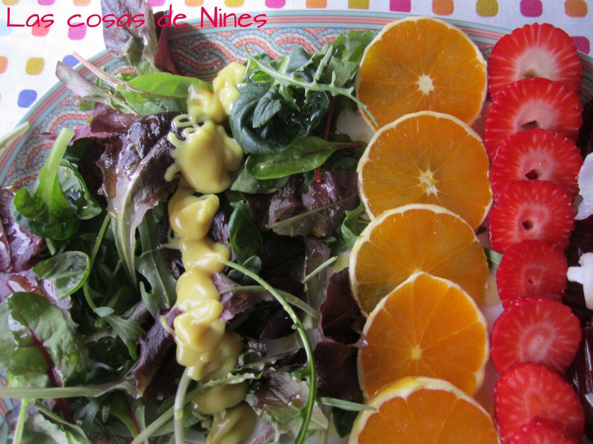 Esta es una auténtica delicia, que he probado y estoy segura, que si vencéis las reticencias de mezclar lechugas y frutas os encantará.