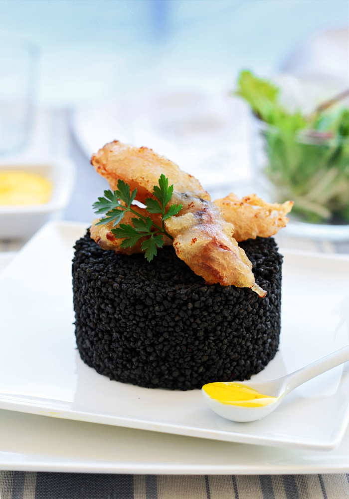 Vertemos el caldo de pescado caliente en el vaso de la batidora; añadimos la tinta de calamar, el sofrito y trituramos. Sazonamos con sal.
