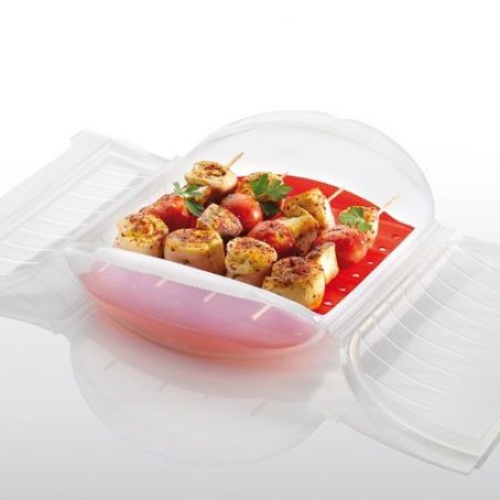 Lékué: brochetas de pollo con verduras y arroz blanco