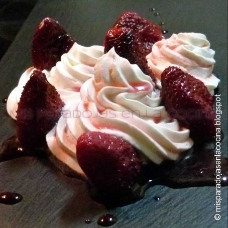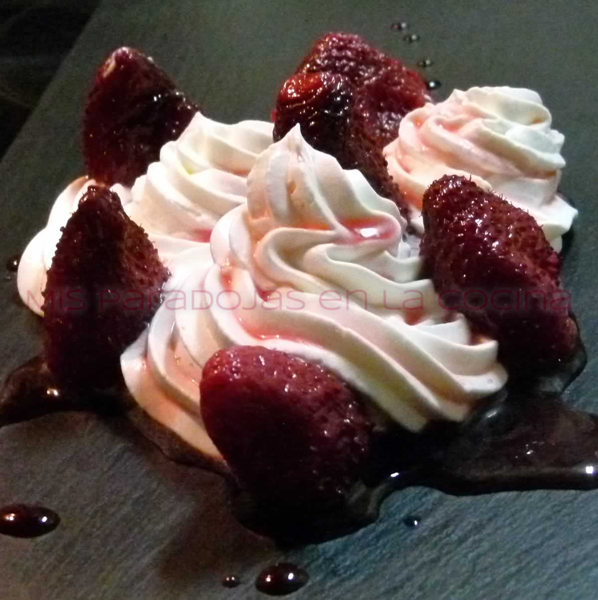 Un poco antes de servir el postre, montaremos la nata muy fría con el azúcar y punto de vainilla (puede ser poniendo una parte azúcar avanillado en la cantidad de azúcar, unas gotas de extracto o, mejor que mejor, un poco de vainilla natural). Disponemos en una manga pastelera con boquilla a vuestra elección (a mí me gusta mucho la rizada para las presentaciones). Montamos el plato con la nata, distribuyendo fresas enteras y salseamos con el almíbar de fresas.