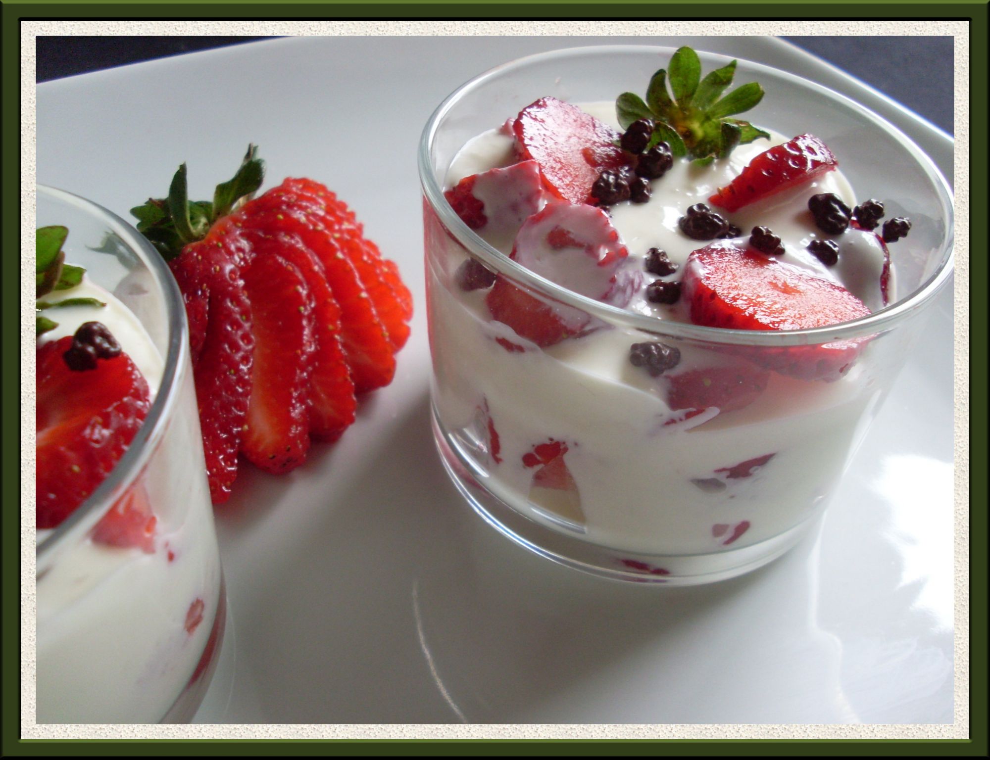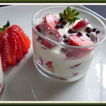 Cortamos las fresas como mas nos guste , colocamos en copas y añadimos la crema . Decoramos a nuestro gusto, con perlitas de chocolate, trocitos de nueces, etc.