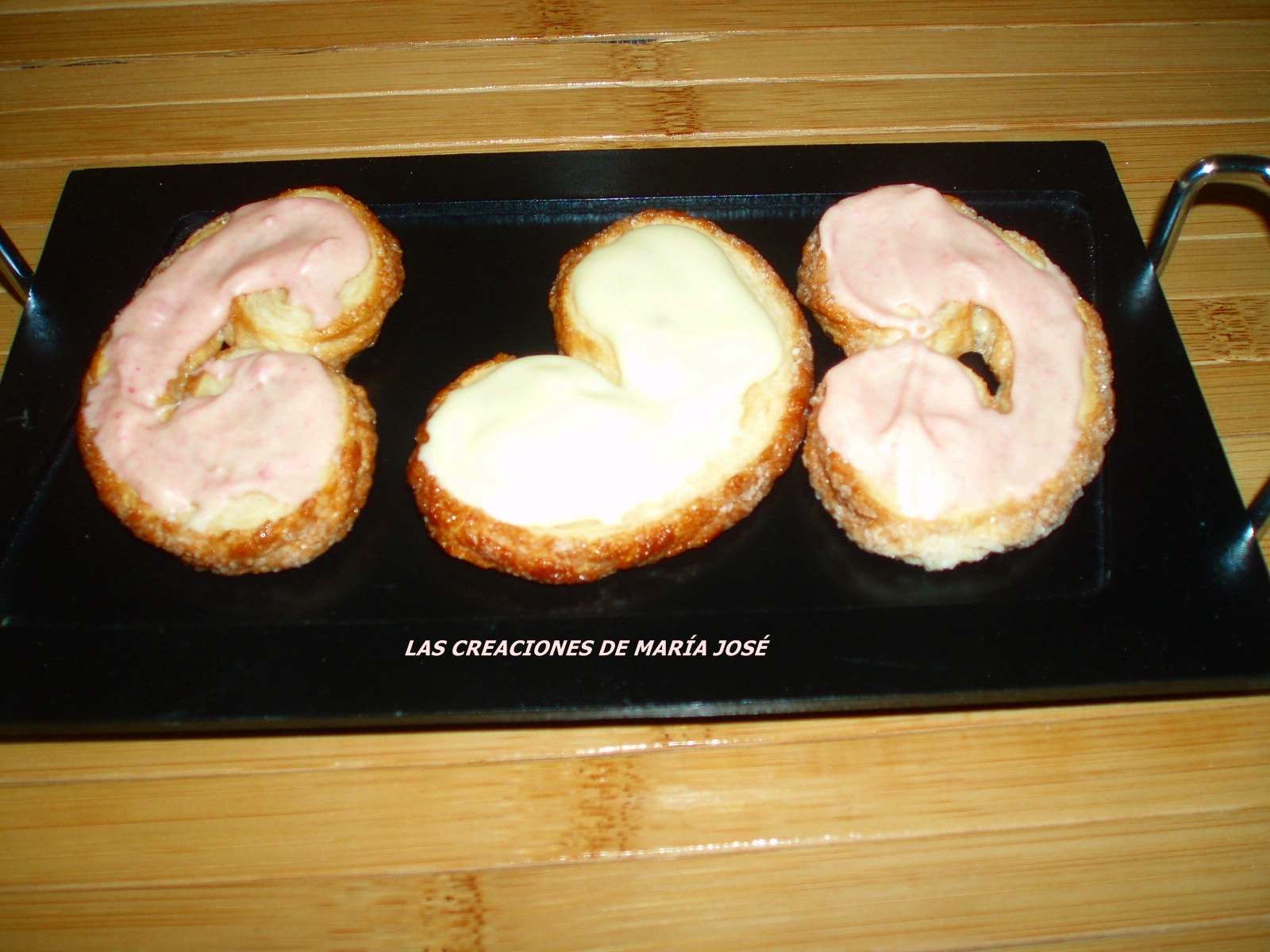 Extender la plancha de hojaldre y echarle azúcar por encima, llevamos de un lado a otro la masa hacia el centro. Volvemos a repetir la operación hasta llegar hacer un rectángulo y vamos cortando porciones de 1 cm. Precalentar el horno a 200°, meter las palmeritas y cuando veáis que están doradas sacarlas. Fundir el chocolate al baño maría echar 2 gotas de colorante rojo y remover. Cubrir las palmeritas con el chocolate que se habrá quedado de color rosa. Dejar enfriar para que se endurezca de nuevo el chocolate.