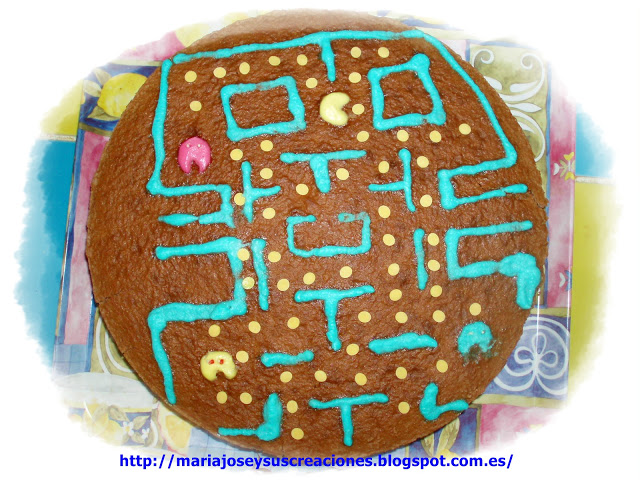 Podéis hacer el bizcocho como os guste y partirlo en 3 partes. Calentar en un vaso el zumo de 1/2 limón con agua y 1 cucharadita de azúcar, cuando este casi frio remojáis la primera capa del bizcocho. Fundís una tableta de chocolate y la echáis en la primera capa, ponéis la siguiente encima. Echáis en el bol de la batidora los 2 brik de nata, 1/2 tarrina de queso y 1 cucharadita de azúcar, se bate todo muy bien que quede espeso y se echa encima de la siguiente capa, dejando un poco para hacer el dibujo del comecocos. Se pone la siguiente capa y se hacen los dibujos. Para hacer los colores se echa el colorante al gusto en la nata sobrante.