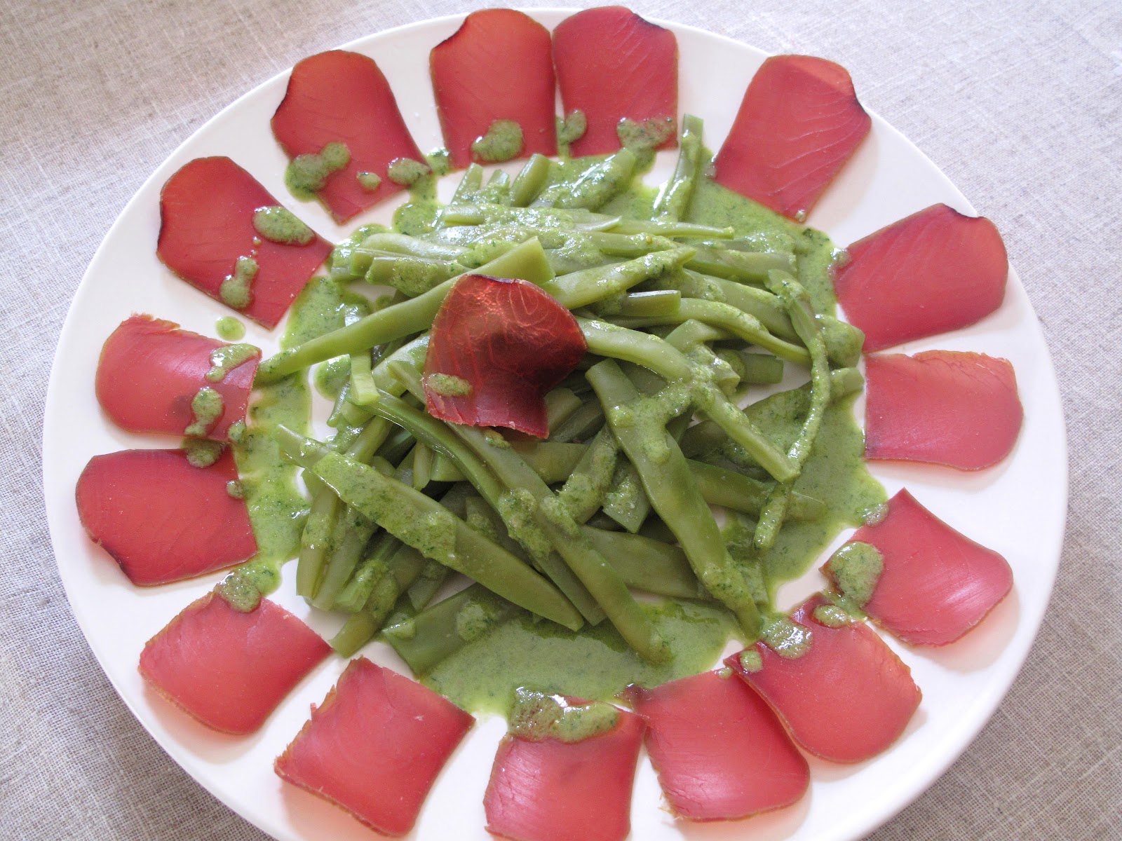 - 400 grs. de judías verdes tiernas, 150 gr. de mojama cortadas en laminas lo más finas posibles, 10 cucharadas de aceite, 2 cucharadas de vinagre, un pellizco de jengibre en polvo, 2 cucharadas de pistachos verdes, 1 manojo de perejil y sal. En la preparación de esta receta he utilizado judías planas (bachoquetas) pero podéis utilizar de otro tipo.