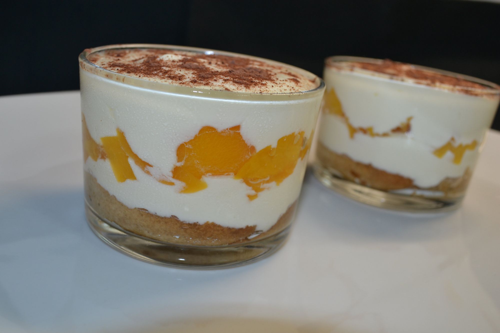Preparamos los recipientes donde vayamos a servir el tiramisú. Mojamos los bizcochos en el café y los colocamos en la base de nuestro recipiente. Encima vamos poniendo una capa de la crema de queso, unos trozos de melocotones, y otra capa de crema. Decoramos con cacao en polvo en el momento de servir