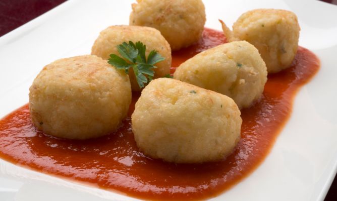 Formamos las albóndigas, las enharinamos y freímos en una sartén con aceite. Escurrimos sobre un plato forrado con papel absorbente de cocina. Calentamos la salsa de tomate, colocamos encima las albóndigas y adorna con unas hojas de perejil.