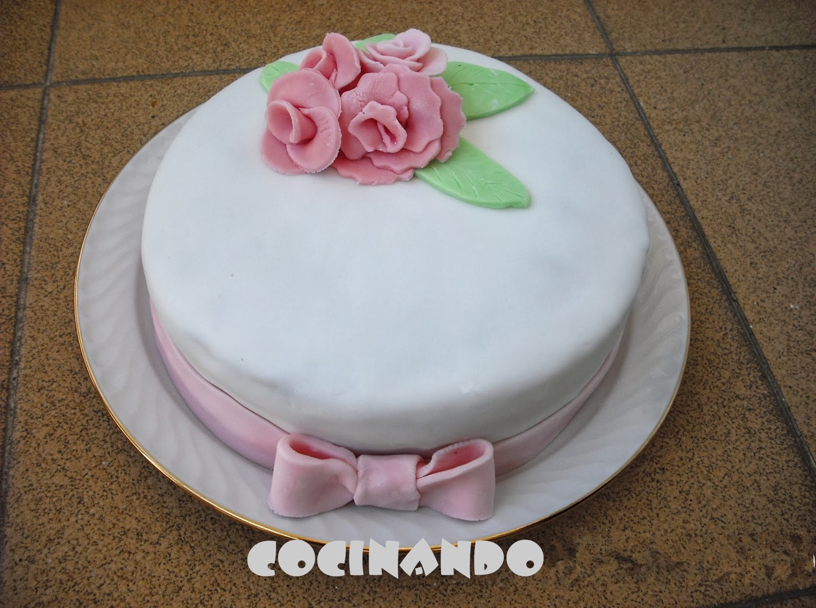 Hacemos unas flores con el fondant rosa y con el verde hacemos unas hojitas, las colocamos sobre la tarta como se ve en la imagen. Ahora hacemos, con fondant rosa, una tira larga y rodeamos con ella la base del pastel. Hacemos un lacito y lo colocamos en el centro.