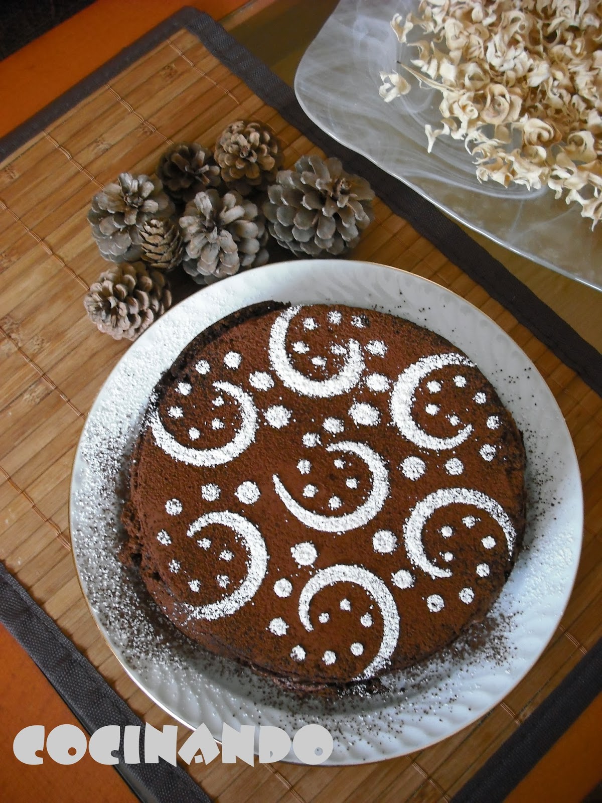 Yo lo he cubierto con un poco de cacao en polvo y he hecho estos dibujos (con ayuda de una plantilla) con azúcar glas.