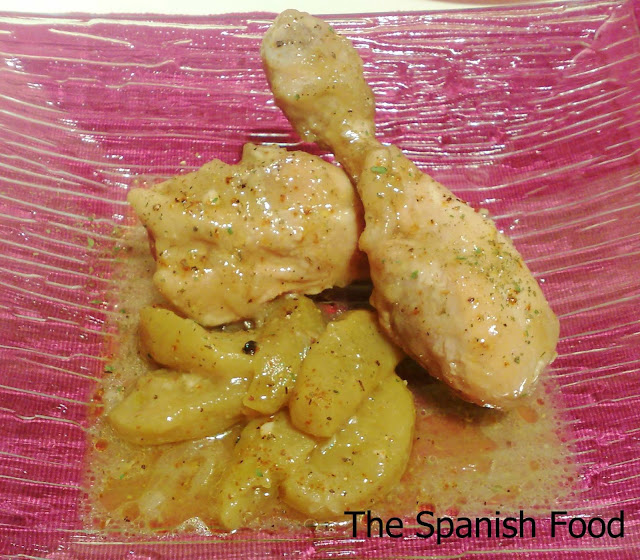 En la misma sartén donde hemos dorado el pollo, pochamos las cebollas partidas en juliana. Una vez esté transparente y blandita, le incoporamos el pollo reservado, las manzanas peladas y cortadas en gajos no demasiado gordos y salteamos el conjunto unos instantes.
