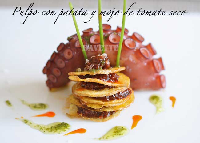Colocamos en un plato una pata cocida de pulpo vamos poniendo al lado las rodajas de patata intercalándolas con el mojo de tomate. Finalizamos con un poco de sal maldon por encima del pulpo, un chorrito de aceite de oliva.