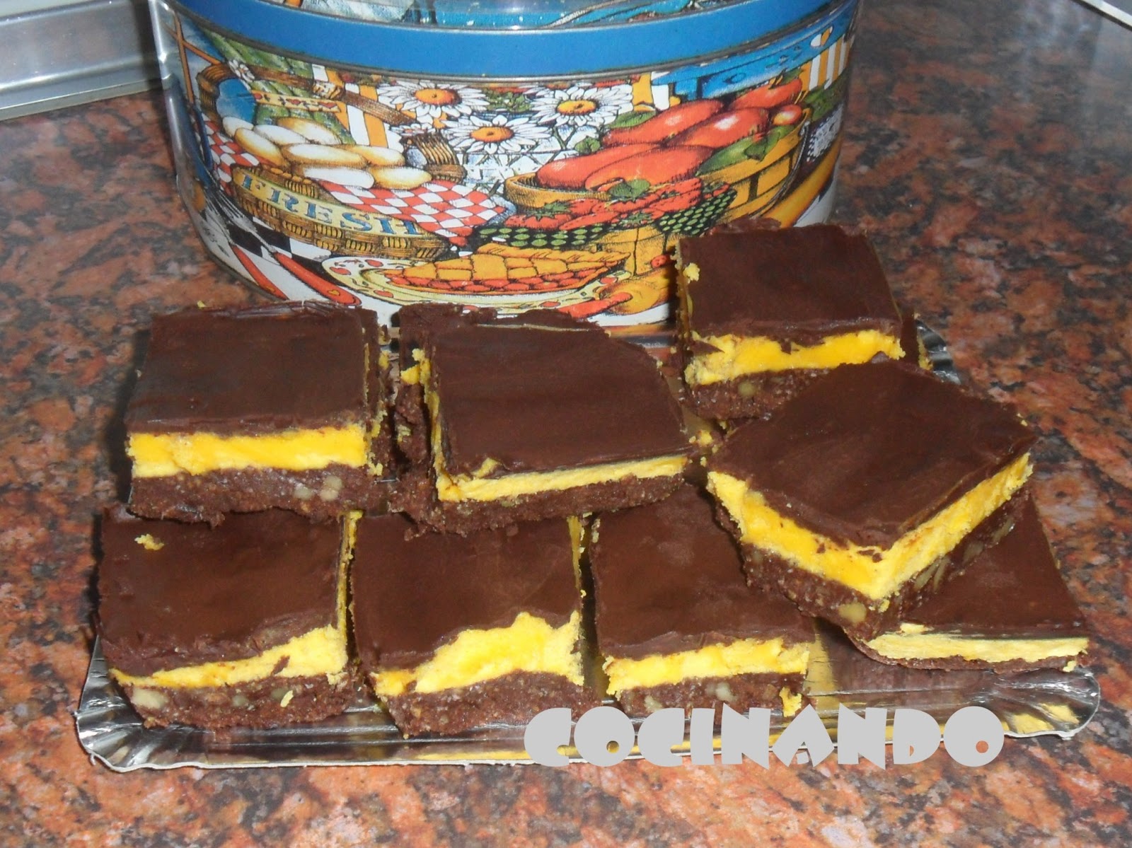 Hoy os traigo otra receta dulce, se trata de un cuadrado de chocolate que no necesita horneado y que recibe su nombre de la ciudad canadiense de Nanaimo. La barra surgió a principios de los 50, cuando un ama de casa envió la receta a un concurso resultando ganadora por lo que acabó haciéndose muy popular. Y la verdad es que no me extraña porque está buenísima... yo la hice para tomar un café con los amigos y ha gustado mucho, incluso me han pedido la receta...