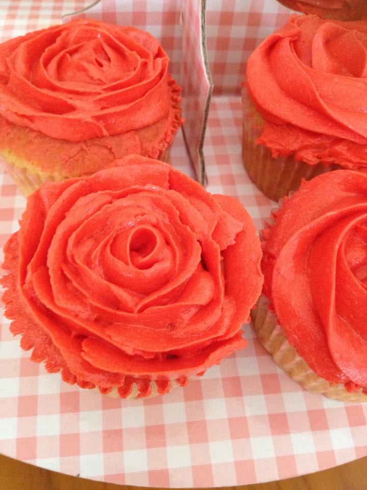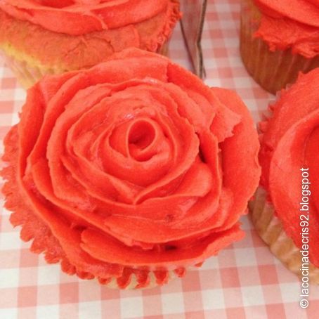 Unos cupcakes de fresas decorados con una boquilla de petalo.