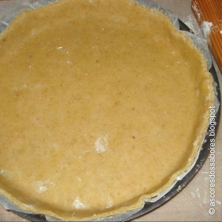 Luego, sobre una superficie espolvoreada con harina, estirar la masa con el rodillo. Llenar el molde de tarta (untado con aceite y espolvoreado con harina) con la masa y picar el fondo con los dientes de un tenedor.