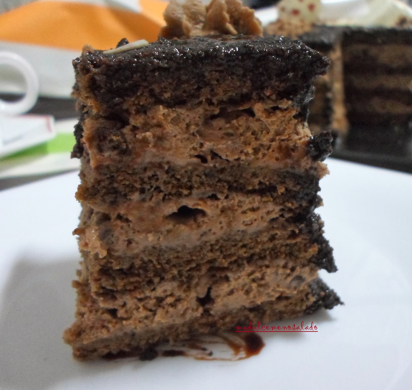Ponemos una parte del bizcocho en el plato, regamos con el almíbar de café, y a continuación y con ayuda de la manga pastelera empezamos a poner la trufa. Y de nuevo lo mismo, bizcocho, regar con el almíbar de café y trufa, terminamos con bizcocho para poner el glaseado de chocolate. Y una vez puesto es mejor dejar en la nevera una hora al menos.
