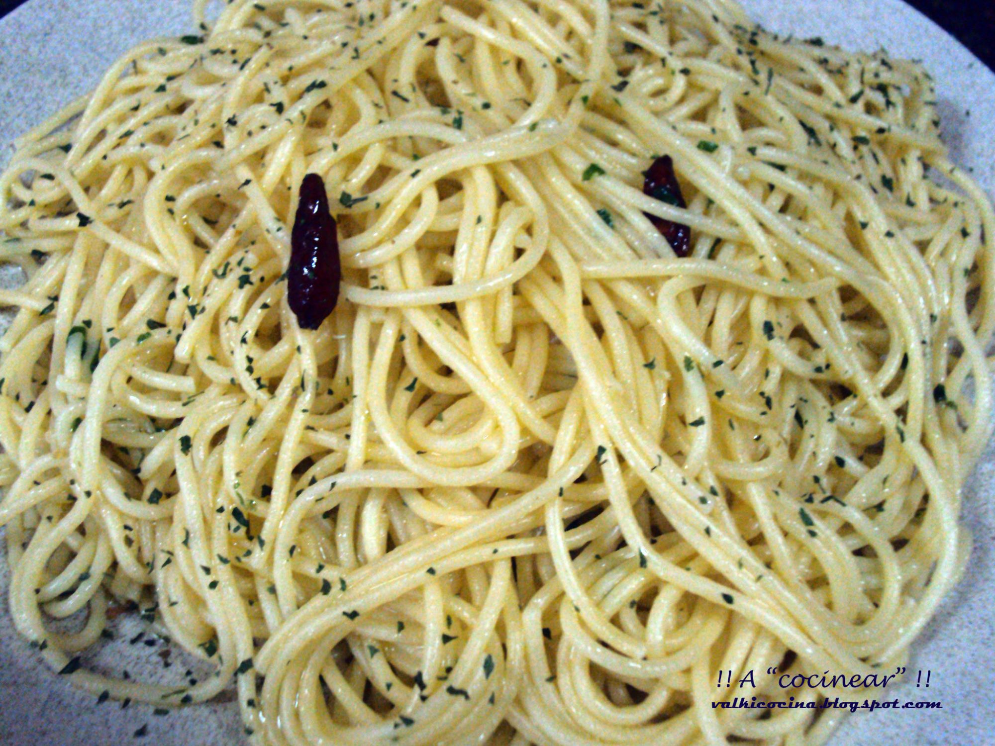 Echa aceite de oliva en una sartén..., (lo suficiente para cubrir el fondo), y pica un par de dientes de ajo. Cuando empiecen a dorar, añade la pasta escurrida, perejil picado..., e incorpora dos o tres guindillas, (cayena).