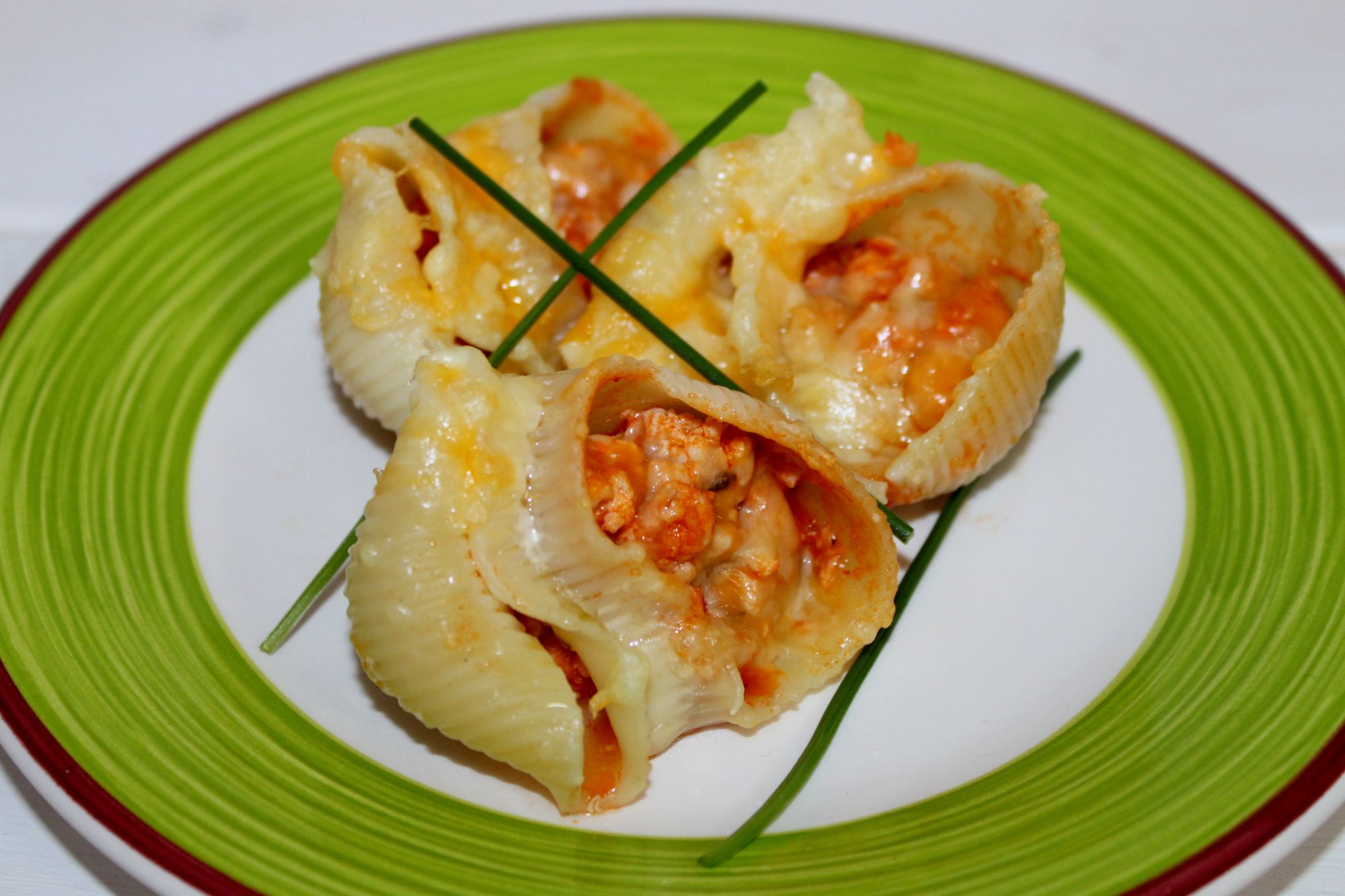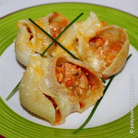 Rellenamos con una cucharilla los lumaconis con la carne que hemos hecho antes y los vamos colocando en la fuente de horno encima del tomate.