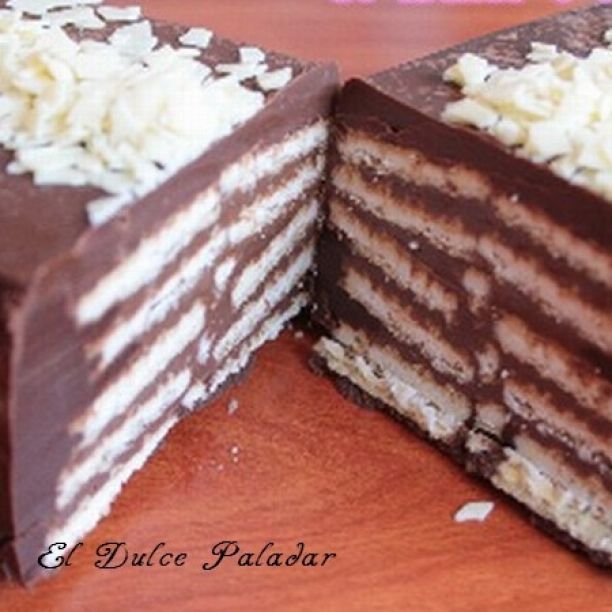 Comenzamos derritiendo todos los ingredientes de la cobertura en el micro con mucho cuidado o en el baño maría, mezclando bien hasta conseguir una crema homogénea y suave. En el fondo del molde vertemos una capa de un centímetro de espesor de esta mezcla dejamos enfriar unos minutos y a continuación una capa de barquillos de nata, dejando a los bordes una separación con las paredes del molde de unos milimetros, luego ponemos una capa de crema de cacao, otra de barquillos, otra de cacao... así hasta terminar el paquete de galletas.