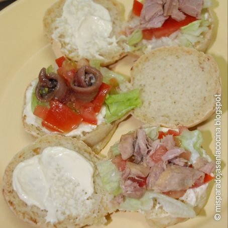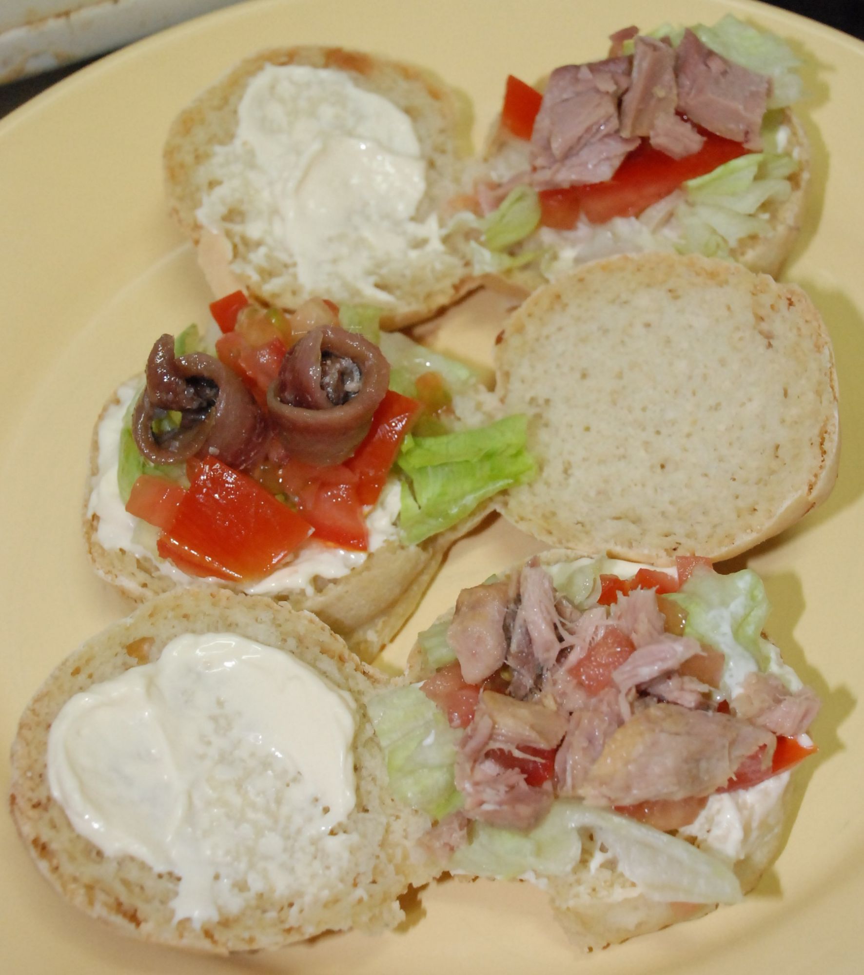 Seguiremos la fórmula del pan simple ("rápido") pero cuando terminemos de amasar, porcionaremos la masa en piezas de unos 30-50 gramos y bolearemos; dejamos fermentar tapadas en la bandeja de hornear y seguimos los pasos de precalentado y horneado. Mientras se hornea el pan prepararemos una mahonesa (podemos usar una de bote que sea buena), lavaremos y cortaremos la lechuga y el tomate en tamaño acordes al pan. Una vez que el pan esté listo y se entibie, lo cortaremos por la mitad poniendo una capa de mahonesa en cada cara. En la base pondremos la lechuga y el tomate, finalizando unos montaditos con el atún escurrido y otros montaditos con las anchoas escurridas. Servir y disfrutar de la cena.