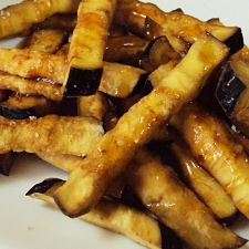 Lava la berenjena, parte a rodajas, y luego en bastones.
