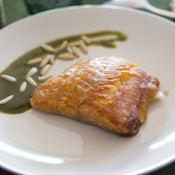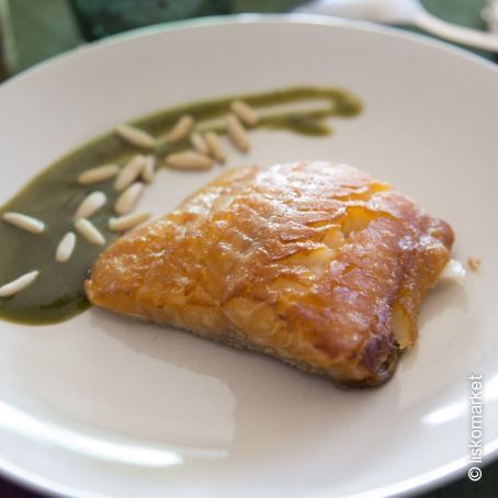 Bacalao ahumado con pesto de albahaca y piñones