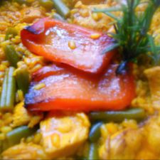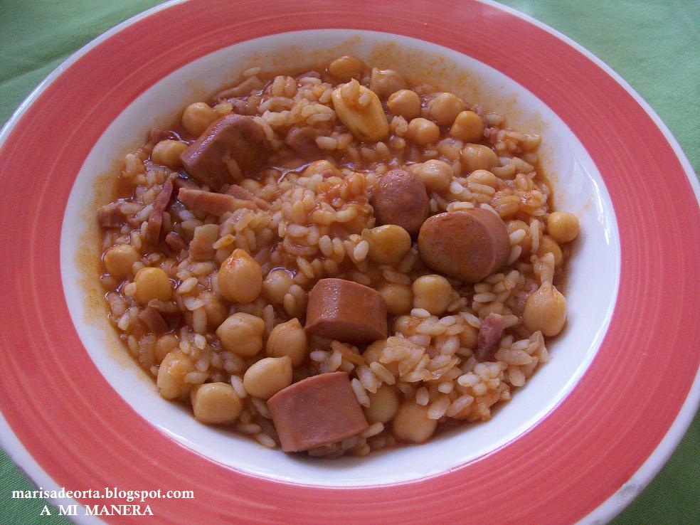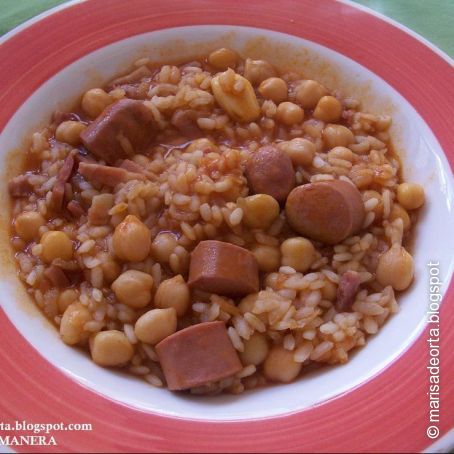 - En la misma sartén sofreir el arroz con el tomate y los garbanzos y verter en una cazuela apta para el horno, colocar encima el beicon, las salchichas y el ajo y por último cubrir con el caldo.