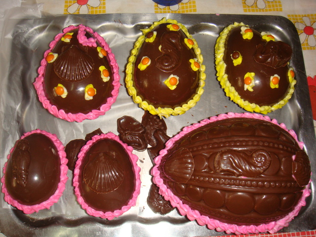 Rellenar los moldes de huevos y vaciarlos dándolos vuelta y limpiando bien los bordes para que se queden huevos en el centro.