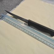 Mientras tanto, preparamos el hojaldre. Para ello lo dividimos con un cuchillo, con ayuda de una regla, en tres rectángulos y después en 6.