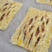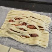 Montamos los cuadrados poniendo debajo el hojaldre sin enrejado, encima un par de cucharadas del sofrito de carne y cubrimos con el hojaldre enrejado.