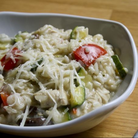 Añadimos el caldo caliente a la mezcla de arroz ayudándonos de un cucharón, poco a poco y removiendo constantemente, hasta que cada cucharada se absorba bien. Seguimos cocinando a fuego lento y añadiendo caldo (es posible que no sea necesario utilizarlo todo) hasta que el arroz se ponga gordito. La consistencia final debe ser cremosa (tardará unos 20-25 minutos)