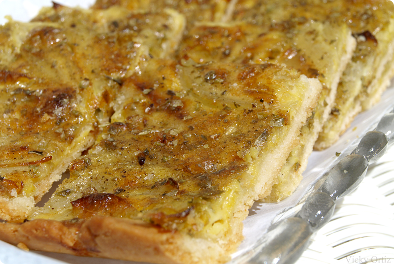 Freímos la cebolla y la extendemos encima de la massa, a continuación echamos los piñones y el bacalao.