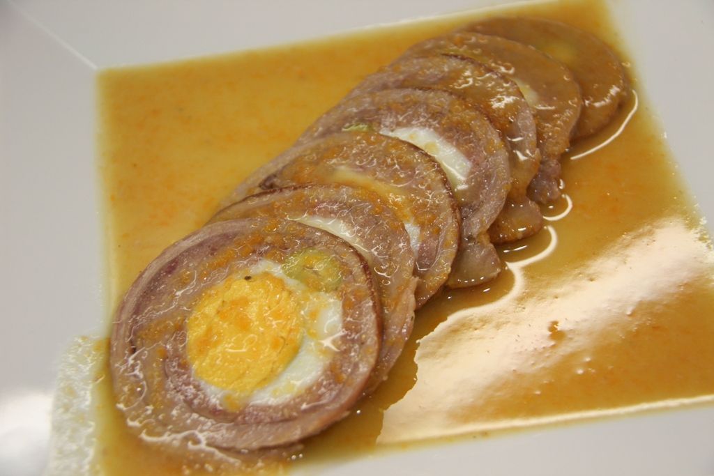 Abrimos la carne de ternera y ponemos el bacon, el pate, el queso y el huevo.
