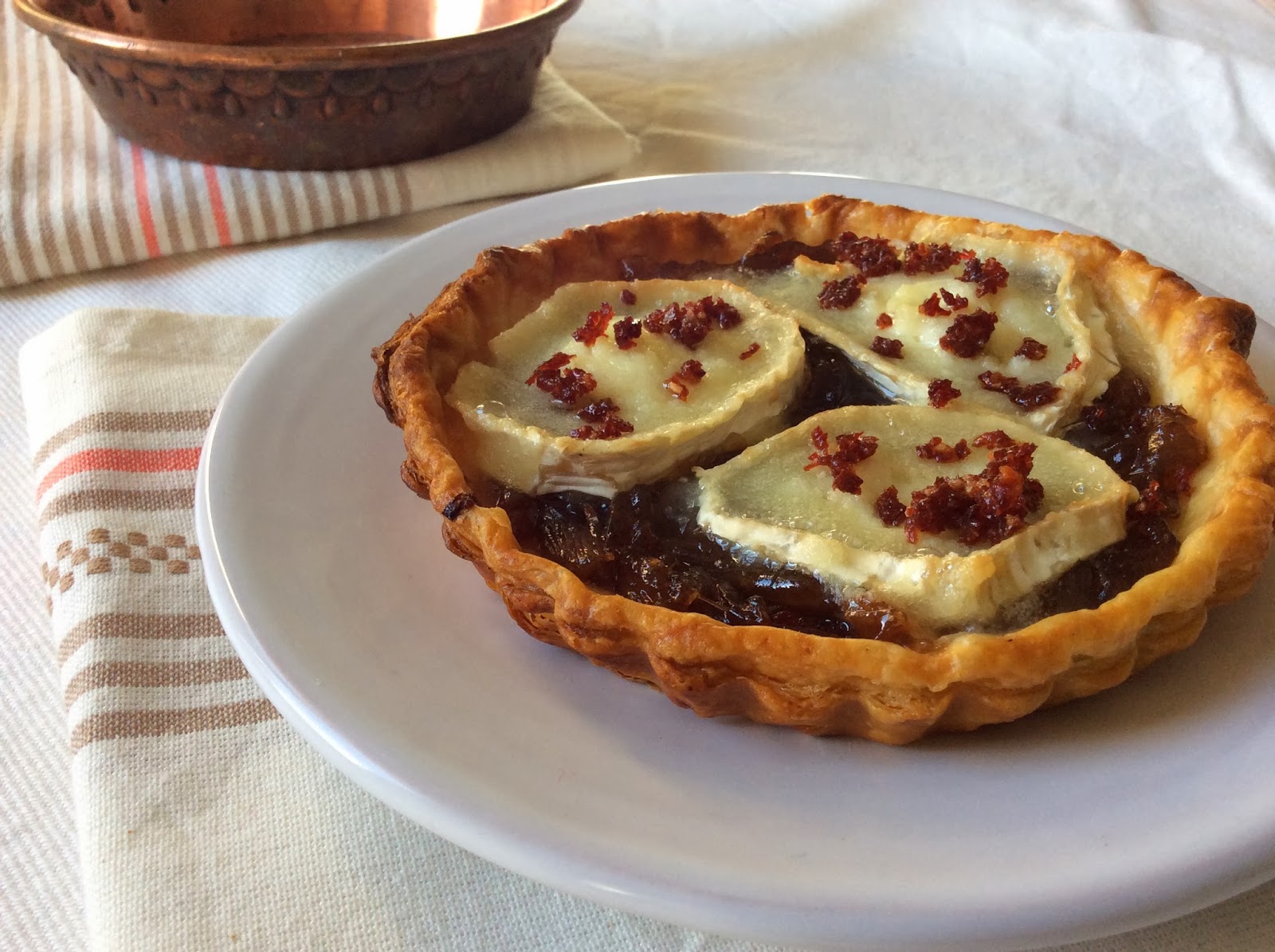 El último paso es rellenar las tartaletas. Ponéis la cebolla confitada en el fondo de la tartaleta, encima las lonchas de queso de cabra y lo metéis en el horno sólo con el gratinador, para deshacer un poco el queso.