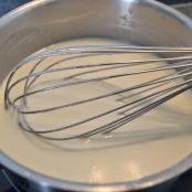 En un cazo, ponemos la leche (apartamos un poquito para deshacer los sobres de cuajada), la nata, el relleno de las galletas y calentamos. Removemos con unas varillas para que se deshaga el relleno de las galletas y vertemos la leche con la cuajada disuelta. Cuando empiece a hervir, apartamos.