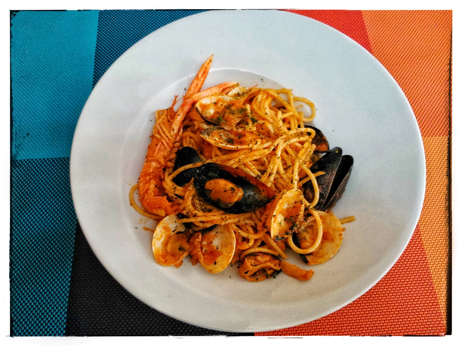 Cuando se hayan abierto todos los mejillones procedemos a quitarles una de los caparazones para que nos resulte más sencillo a la hora de poner la pasta, pelamos las gambas y las añadimos a la paellera, junto con el tomate frito y dejamos a fuego lento un par de minutos, escurrimos nuestra pasta y la echamos con los mariscos en la paellera y con ayuda de un par de cubiertos removemos todo para que cojan todo el sabor, ya tenemos preparado nuestro plato.