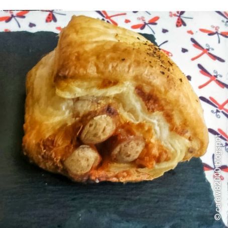 Una vez preparadas las dos masas de hojaldre las estiramos en una superficie limpia y ponemos el queso y las salchichas en cada una, más o menos a la mitad de la masa y enrollamos haciendo un rollito