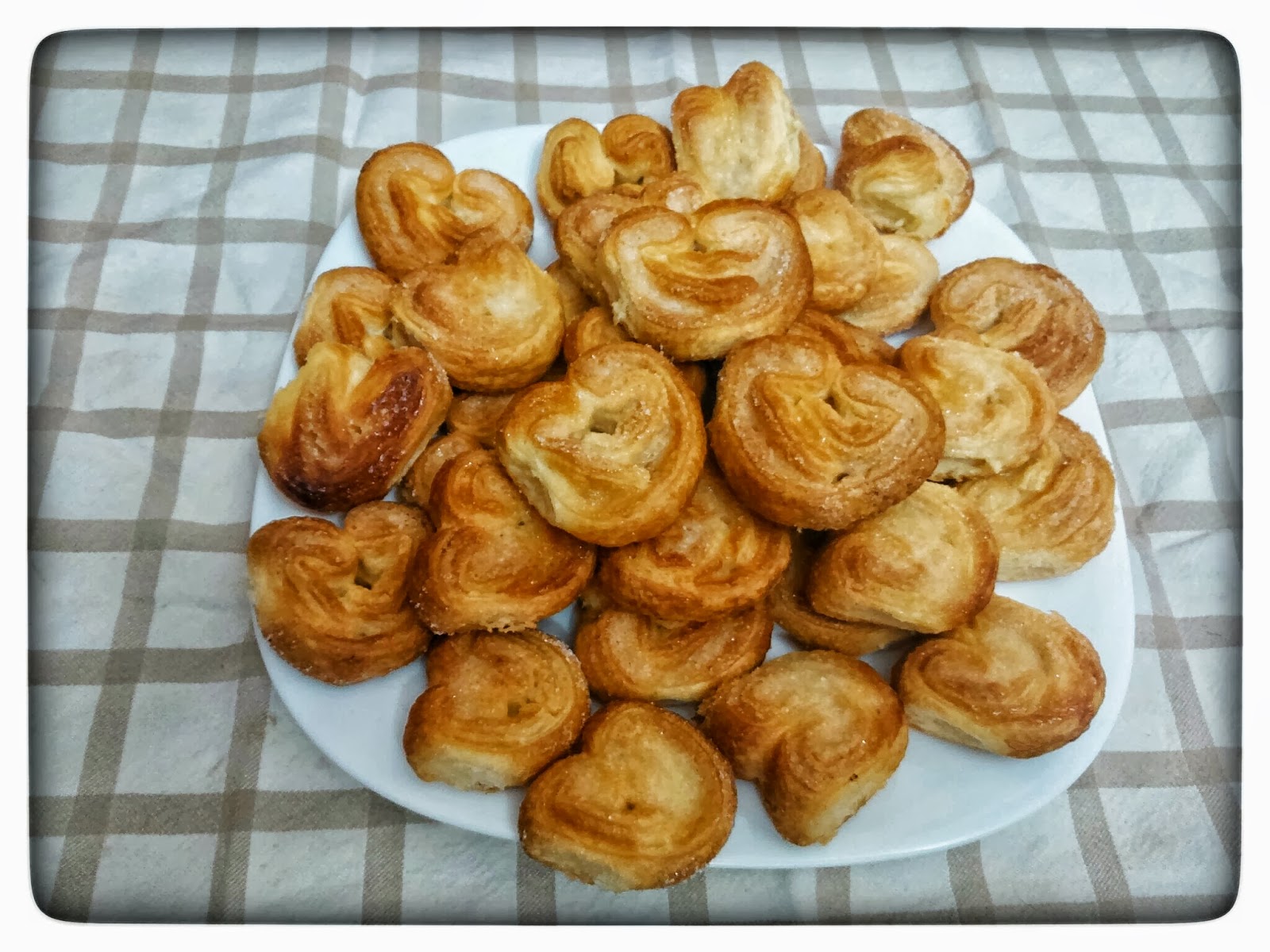 Ahora doblamos cada lado de nuevo a la mitad y ponemos otro poco de azúcar y repetimos con el rodillo , ahora ya doblamos a la mitad y con ayuda de un cuchillo afilado y de un solo corte , vamos cortando la masa al tamaño que más nos gusten las palmeritas , yo sugiero que estas de azúcar sean de 1cm de grosor, repetimos esta operación con las dos planchas y las vamos colocando sobre bandejas de horno dejando espacio entre unas y otras y dejamos horneando hasta que estén doraditas .